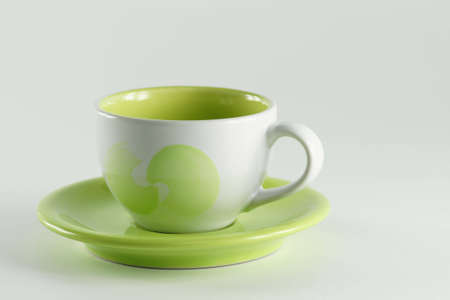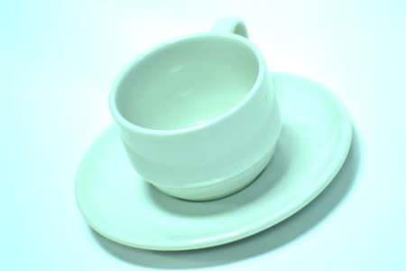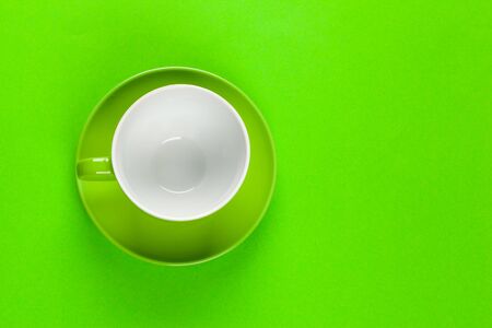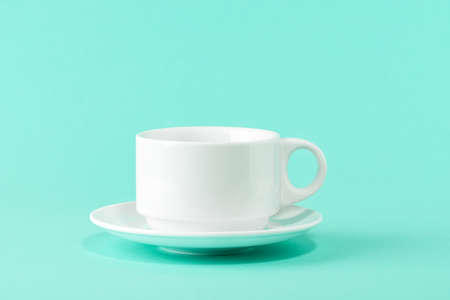 Empty porcelain coffee cup and a saucer over a mint green color background. White ceramic teacup. Modern stylish tableware. Copy space. Front view.