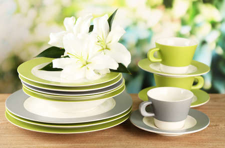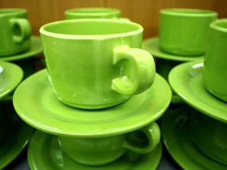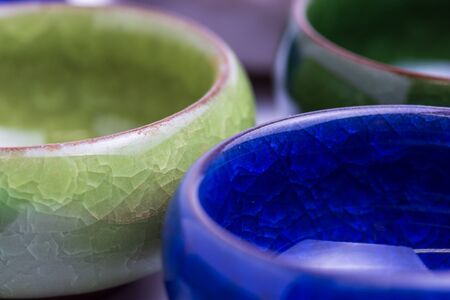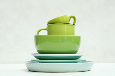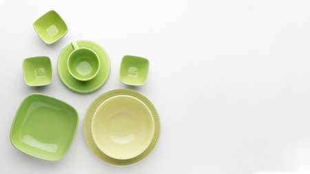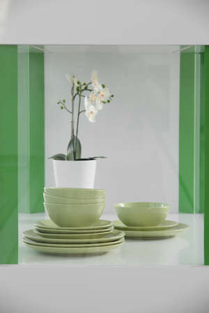 Kitchen Utensil, Collection of Green Porcelain Bowls and Plates Preparing for Serve Hot and Cold Food.