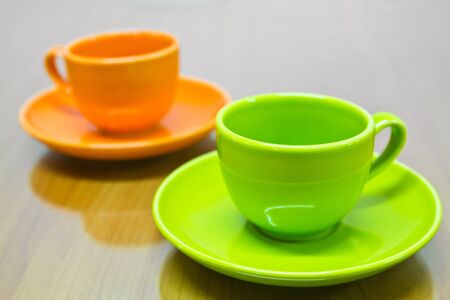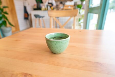 Empty Green cup or mug ceramic on wooden background, dark tone.
