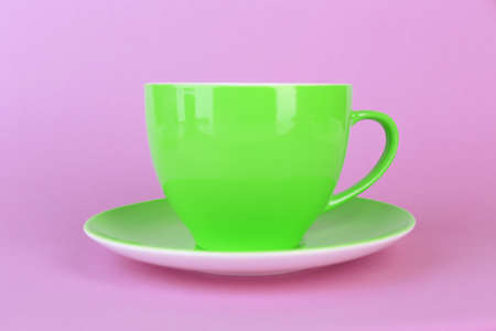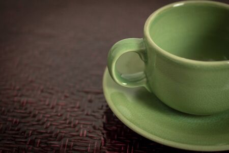 Empty glazed green coffee cup with saucer on red dark woven textured background.