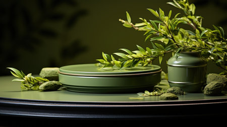 AI Generated. Elegant Green Decor with Unique Vases and Jewelry on Natural Background