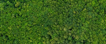 Aerial view of green coniferous forest. Top view of coniferous forest.