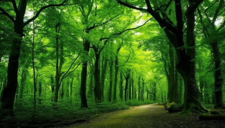 Discover a tranquil forest pathway enveloped in lush greenery and majestic trees, perfect for nature walks, peaceful retreats, and outdoor exploration.