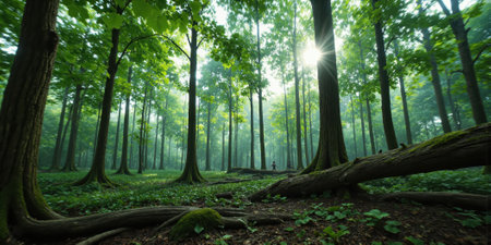 Woodland showing sunlight filtering through vibrant green leaves in a dense forest canopy with dark tree trunks creating a natural, serene woodland atmosphere and...
