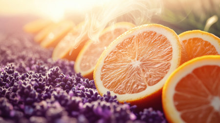 Citrus slices sparkle under sunlight, mingling with aromatic coffee steam above fragrant lavender fields, creating a delightful sensory atmosphere.
