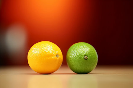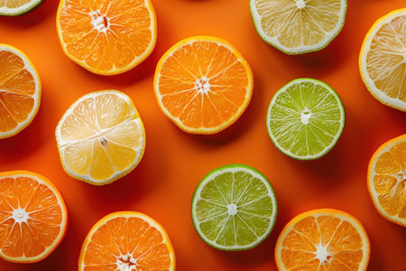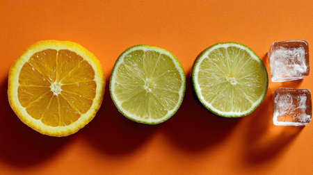 Citrus fruits slices arranged on vibrant orange background for refreshing summer cocktail recipe or healthy diet option