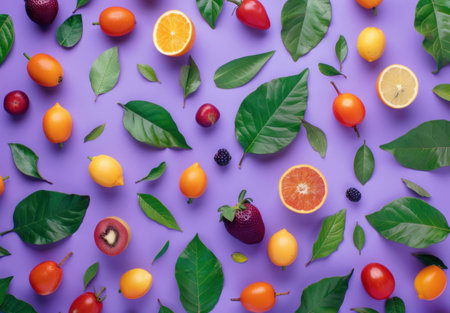 colorful fruits and leaves on a purple background, including lemons, oranges, and berries, arranged in a flat lay style for a vibrant and fresh concept