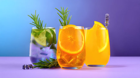 Bright and refreshing summer drinks featuring citrus and herbs, beautifully arranged in colorful glasses against a soft gradient background. Perfect for summer celebrations.