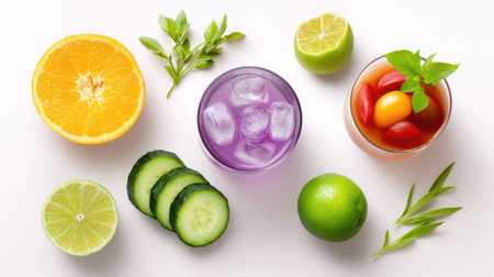 fruits and herbs delicately arranged in an elegant pattern against a pristine white background, featuring refreshing mint leaves, vibrant lemon and orange slices, fragrant lavender flowers.