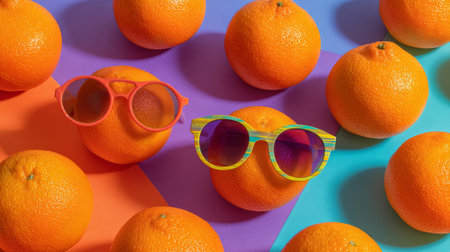 Vibrant orange fruits styled with funky sunglasses, arranged on bright gradient background, playful summer stock photo flat lay
