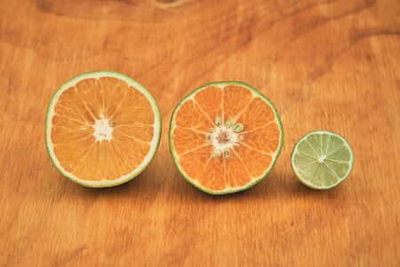 Orange fresh fruits cut half or orange slice segment isolated on white background. selective focus and orange and green tones