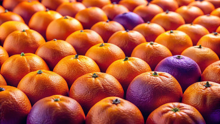 Sliced oranges arranged on a bright purple and pink background with some leaves partially obscuring the fruit. The vibrant colors create a striking contrast, highlighting the fresh and juicy texture of the citrus fruit.