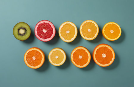 Brightly sliced citrus fruits form a neat pattern against a lively blue backdrop, with subtle shadows highlighting their vivid colors and fresh, zesty appeal.