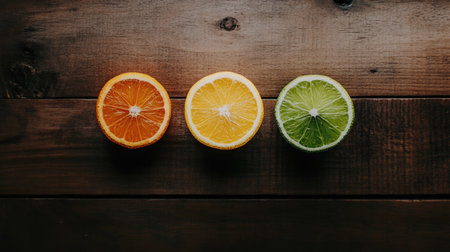 Vibrant citrus slices including orange, yellow citrus, and lime are arranged on a rustic wooden table, enhancing any kitchen or food setting with fresh appeal.