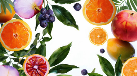 A stunning display of fresh fruits including citrus, berries, and vibrant leaves creates a lively and colorful composition for tropical themes. Perfect for decor or culinary use.