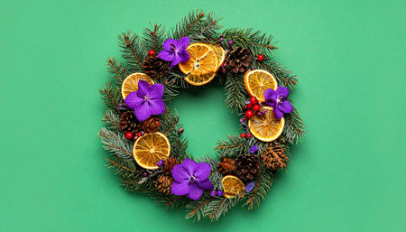 Christmas wreath with fir branches, dried oranges and purple flowers on green background