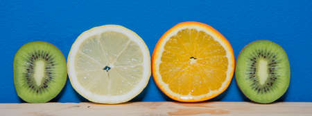 Organic food concept with fresh and ripe kiwi, orange and lemon on concrete background with copy space
