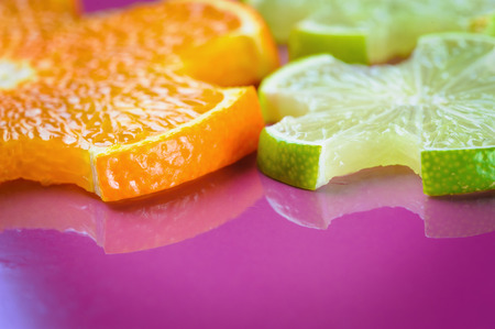 Fresh citrus slices glistening with water drops on vibrant purple background
