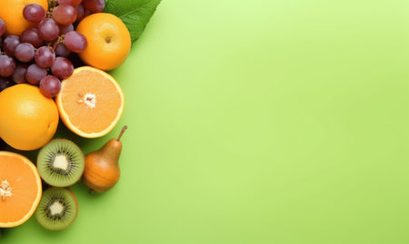 AI Generated. Top view flat lay background with fruits grapes orange slices with leaves on yellow
