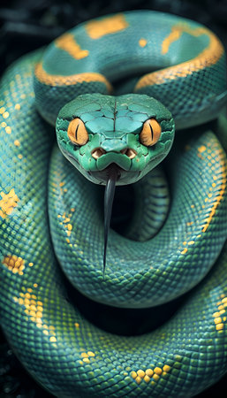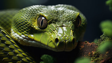 Fierce Green Python With Forked Tongue Posing in Natural Environment Closeup shot of a venomous snake with scaly skin and intimidating features ready to strike in its natural habitat