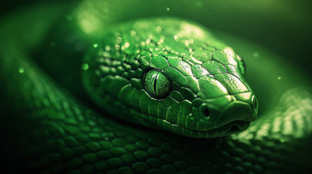 A close-up captures a coiled green snake resting on a bamboo perch. The reptile displays a textured, vibrant emerald skin with patterns. The composition features soft lighting and a blurred background suggesting a natural habitat. Suitable for various editorial and commercial applications.
