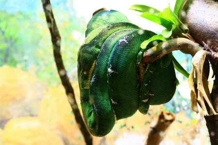 Green snake in the forest. Green boa constrictor.