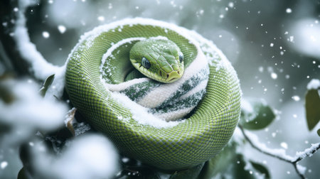 A stunning green snake curls gracefully on a tree branch, surrounded by a serene snowy landscape. The vibrant colors and winter setting create a captivating wildlife scene.