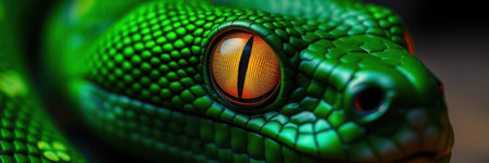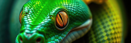 amazing green snake with yellow eyes against dark background. close up. AI generated