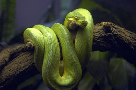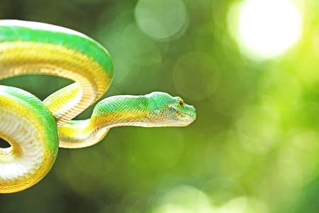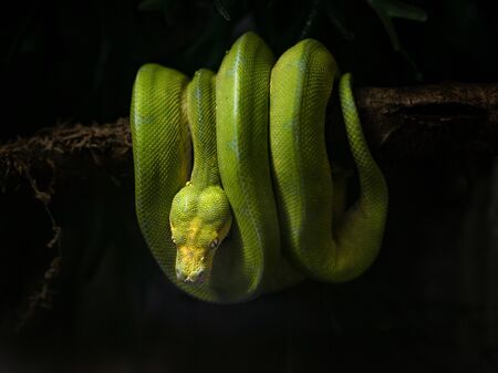 Cute Green tree python (Morelia viridis) on the tree branch. Green tree pythons are found throughout the tropical rainforests of Australia and New Guinea, both in the canopy and on the forest floor.