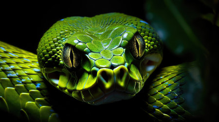 Intense closeup of a green pit viper, its golden slit eyes and bright scales glowing under the light, with dark background emphasizing details