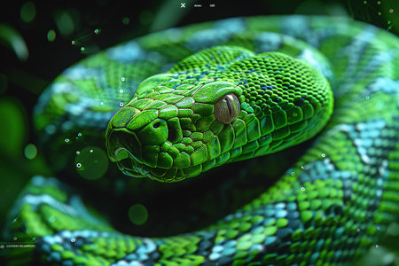 A vibrant green and blue snake coils peacefully against a contrasting black background, showing its unique scales and intricate patterns in stunning clarity.