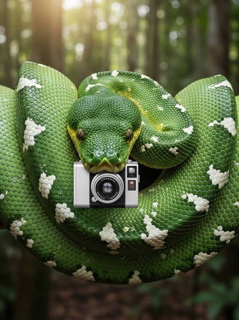 A green snake with white spots holds a camera in the forest