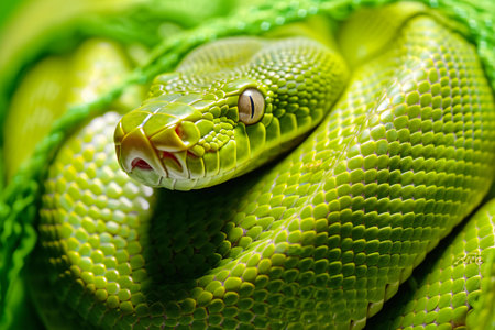 AI-generated image of a vivid green tree python coiled in a resting position, its smooth scales patterned with a thin zigzag line of white and teal along the body.