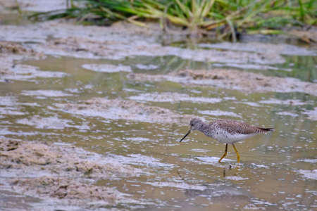 Tringa ochropus walks in a puddle of water and looks for food, the best photo.