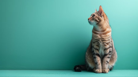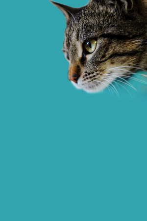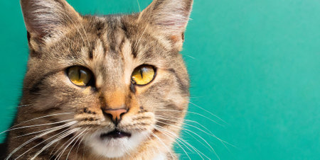 Portrait of a Gray Tabby Cat Gazing at the Camera Against a Turquoise Background