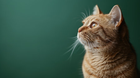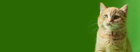 Ginger cat on green background,closeup portrait.Large banner with copy space.