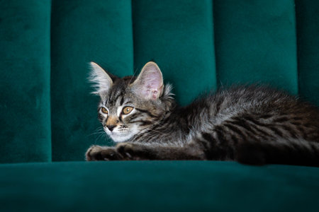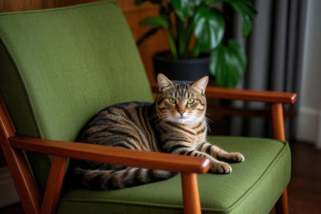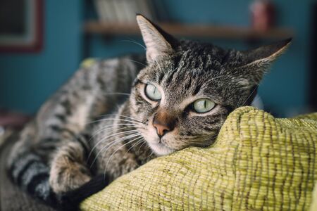 Funny Portrait Arrogant Short-Haired Domestic Tabby Cat Relaxing At Home.