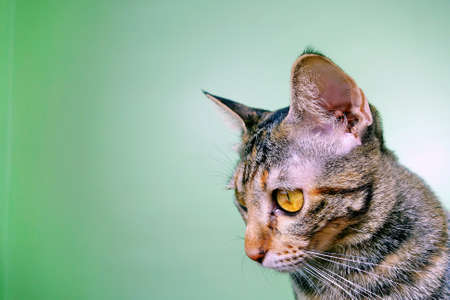 Closeup of a stray cat looking to somewhere over a dark green background. Selective focus. Copy space available