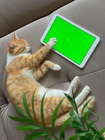 Cute ginger cat with white shirtfront laying on the sofa next to tablet with green screen with green plant in the foreground