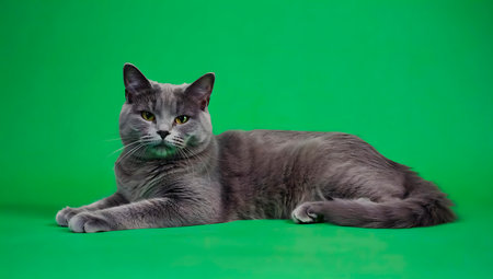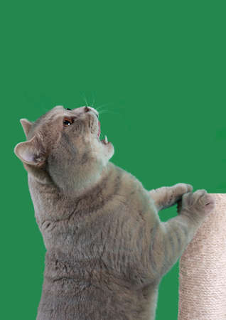 British Shorthair Cat Begging for Food Isolated on Green Background