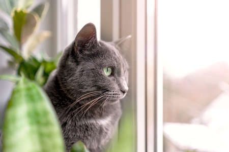 A cute grey domestic cat is resting on a windowsill surrounded by green plants. Fluffy pet looks out the window in daylight. Veterinary concept.