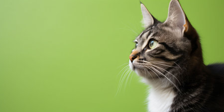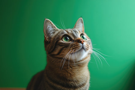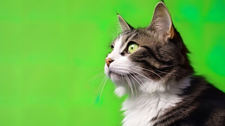 AI Generated. a black and white photo of a cat with its head turned to the side, looking up at something on a green background