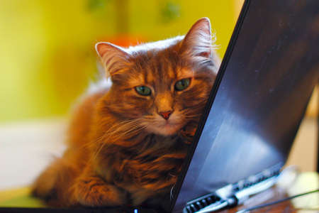 Red cat breed Scottish fold sitting near laptop green screen. Cat food, veterinary advertising concept. Chroma key green screen computer. Pet with digital device.