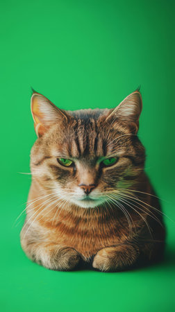 A beautiful cat with striking green eyes is comfortably laying down on a lush green background, creating a serene and colorful scene