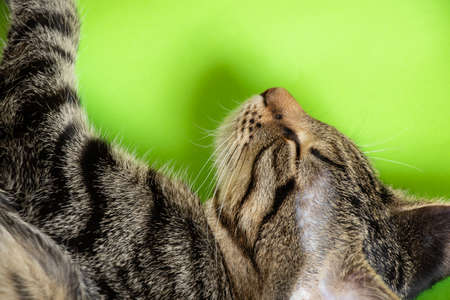 muzzle of a sleeping furry domestic cat in a striped close-up