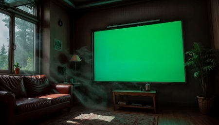 Green screen TV hanging on wall. Concept. Home TV with green screen on wall of house. Plasma TV with wide screen and green background