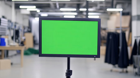 A vibrant green screen monitor set in a fashion design studio. This clean and modern setup is ideal for video production, editing, and creative projects.