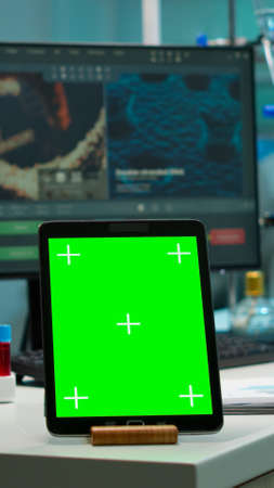 Scientist standing at monitor in background analysing virus evolution while tablet with mock-up green screen working in front. Man lab researcher examining vaccine developent bringing blood samples