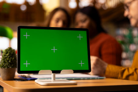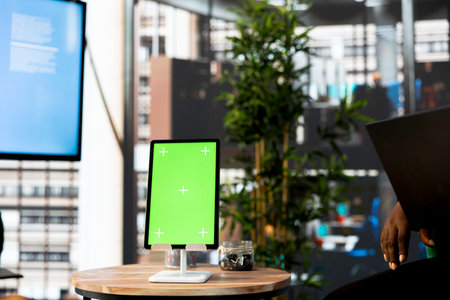 Green screen tablet next to manager overseeing and coordinating daily administrative operations within organization. Supervisor reviewing company administrative systems on mockup device
