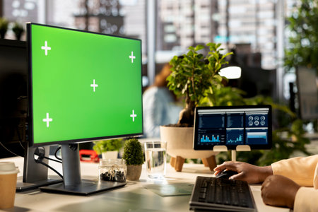 African american employee uses green screen and evaluating performance metrics, working with statistics and company numbers to build a new strategy for development. Office life.